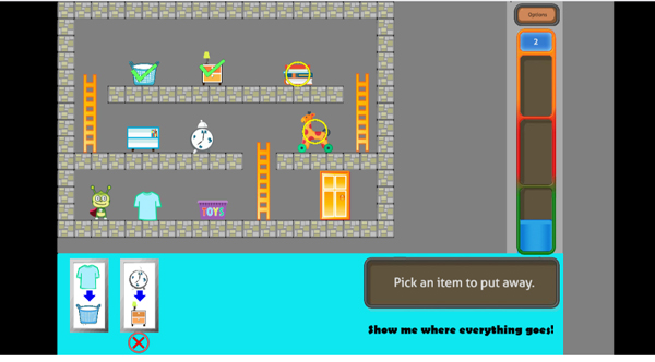 This game allows a child to help an alien clean his room by deciding where to put items away in a space. He must FOCUS AND PLAN (or PLAN for short) first, then ACT by moving the objects, and then REFLECT on where he put things. This is different from earlier games in that the child is allowed to make a mistake on where items are going in the PLAN but not discover that until the wrong step is acted on. Then he must REFLECT on the wrong step and return to the PLAN stage to make a new PLAN. This mimics real learning, where a child can make bad PLANs, like placing clothes in a toy basket, and not realize the mistake until doing it in real life.