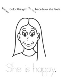 This section isolates a few common expressions for discussion along with printable activities to reenforce the face clues. First a face shows the main area of the face to note when identifying the expression. Then there are a couple of pages showing the expression on faces of people of a different age, sex, and ethnicity. One expression page is made up of photographs, one of line drawings. Some children find line drawings easier to understand initially so it is recommended you start with simple face drawings and then progress to photos This is followed by activities to help identify the clues on a face for this expression. Afterwards activities tie this facial expression to a feeling. Finally, there is a Word Search that provides a maze of hidden terms that are feelings similar to the same feeling as this expression.