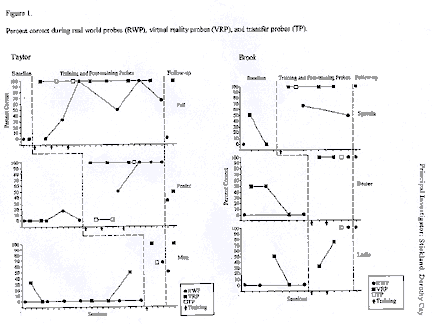1. Phase I Specific Aims and Overview of Results There were three major aims in Phase I: (a) build a prototype of a low cost, commercially feasible virtual reality system that is usable in school settings with children with autism, (b) demonstrate the system's instructional potential for children with autism by establishing its efficacy in teaching these children to comprehend the spoken names of common objects in their environment, and (c) establish that skills learned in a virtual reality environment can generalize to the real world. Phase I period was from March 24, 1997 to August 15, 1997. Key personnel included Dr. Dorothy Strickland, PI, Dr. Susan Osborne, Education Specialist, Dr. Ann Schulte, Psychologist, Dr. Lee Marcus, Psychologist, Autism expert, Karoline Matthewson, Teaching assistant All aims of Phase I grant were met. A low cost VR system (Aim One) was built from (a) a low-end, off-the-shelf PC, (b) a commercial game headset, (c) free VR world toolkits, and (d) instructional object identification software based on standard programming languages and user interface packages. The efficacy of the VR system as an instructional tool for children with autism was tested through a series of single subject design experiments using a multiple baseline, multiple probe design. The results of these studies showed that children with autism rapidly accept and use a VR headset, can acquire new skills in the headset, and these skills generalize to the real world (Aims Two and Three). 2. Virtual Reality System Development (a) System Design. After evaluating the strengths and limitations of existing VR components and the capabilities of children with autism, a VR-system design was chosen that emphasized the ability of a VR headset to limit and focus visual attention with the simplest user interface. Display Views . Two display screens were needed for the tests of the VR system's instructional potential. One displayed an object full screen size in the center of the screen, and one involved a display of four different objects in different corners of the screen. A black background was used in both types of displays. The headset chosen had a horizontal field of view of 60 degrees per eye. Since a person has a normally wider field of view, the user is visually aware of the dark area within the headset that is on both sides of the two screens. By displaying all objects against a black background that matched the side color, there was the illusion of blackness in the full range of vision with distinct objects isolated from each other and their surroundings. Safety features in the VR test design included placing objects at visual distances of over 40 cm to reduce the effects of headset accommodation/convergence mismatch (Mon-Williams, Wann, & Rushton, 1993) and adjusting the headset to the children's smaller inter-ocular distance. The further object placement distance also avoided the need for stereo vision, which is a problem for many individuals, and increased display speed. All virtual reality instructional sessions were limited to 10 minutes to reduce the physical discomfort and eyestrain resulting from prolonged headset use. These steps followed the Risks and Protections section of the Phase I grant proposal. Generating Objects . The three dimensional objects originally created with the currently available VR software toolkits were significantly more primitive looking than the corresponding real world objects, even on the flat screen display. Because of low screen resolution, restricted field of views, and generally poor optics, the same objects displayed in a low cost headset appeared even more primitive and cartoonish. For children with autism, who are cognizant of small variations in their environment, it was felt that this would have introduced an uncontrolled variable into the real world versus headset match. In addition, generating the large number of three dimensional objects to represent the real world objects would have required a significant part of the total funding and time for Phase I. For these reasons, the same object pictures used as the pre-test recognition measurements described below were scanned in and used for the objects displayed in the headset. If other views of an object were needed, scanned images of the other views were overlaid on the screen rather than generating and manipulating true 3-D computer objects. Since unrestricted manipulation by the children of objects was not part of the object identification test scenario, image scanning provided a closer visual match between the objects in the headset screen and the corresponding real world objects. User Choice. A mouse was chosen to use as object identification pointer for the children. All the children in the test were familiar with using a mouse for selection on a flat computer screen. Initial pre-trial testing indicated that the children had no difficulty using the mouse to click on an object displayed in the headset if the mouse position was displayed on the headset screens with a white arrow similar to a normal mouse marker they had previously used. Initially the design also included using the built in head tracker in the headset to allow a child to select an object by looking at it. However, there is always a noticeable latency between when a user moves in a virtual setting and when this movement is displayed in the screen using head trackers. This latency is aggravated by fast, jerky head motion, which was exhibited some of the children in our study who were hyperactive. Because all children could use the mouse and the tracker introduced uncontrollable variables with no discernible benefits, it was dropped from the user interface. The objects remained displayed in front of the children, no matter how they moved their heads. By not regenerating images based on head motion, the virtual environment motion problem of temporal aliasing was also eliminated. Temporal aliasing occurs when a smooth head motion appears a