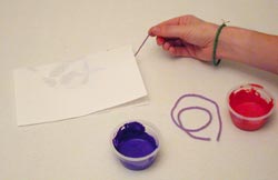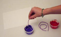 Dip pieces of yarn into the paint. Hold at one end of string, which
