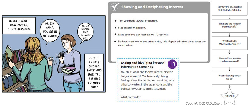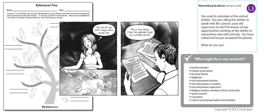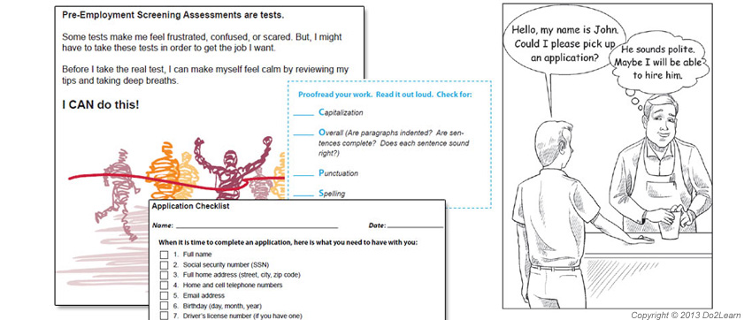 In the Getting a Job unit, instructors will find tools to help their students locate available jobs, submit applications appropriately, and manage application follow-ups. This unit also covers the critical social and conversational skills needed to be successful at a job interview, from dressing appropriately to answering tricky ‘what if?’ questions. Act it Out scenario cards provide opportunities to practice these skills in a low-pressure environment, and coping cards and comics help students manage this often stressful stage of the job search.