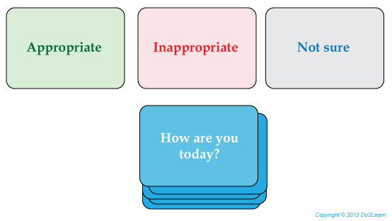 You are working with your student to help him accurately discriminate between appropriate versus inappropriate greetings at school and work. These JobTIPS Concept Sorting Cards are a different form of graphic organizer that allows the student to physically manipulate items in order to categorize them. The student examines each greeting and then determines whether it should be placed in the “appropriate,” “inappropriate,” or “not sure” stack.
