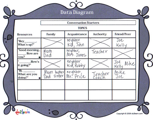 - Complete the Data Diagram graphic organizer to help your student make clear decisions about how to address these different people with appropriate conversation starters.
