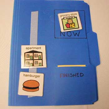 Select the activities that are going to happen, and place them in top to bottom order. Be sure to end with, or include, activities recognized as "treats". Place the current activity in the "NOW" box. When that activity is finished, place it through the slit in the "FINISHED" area, to be stored inside the folder. Put the new current activity in the "NOW" box.
